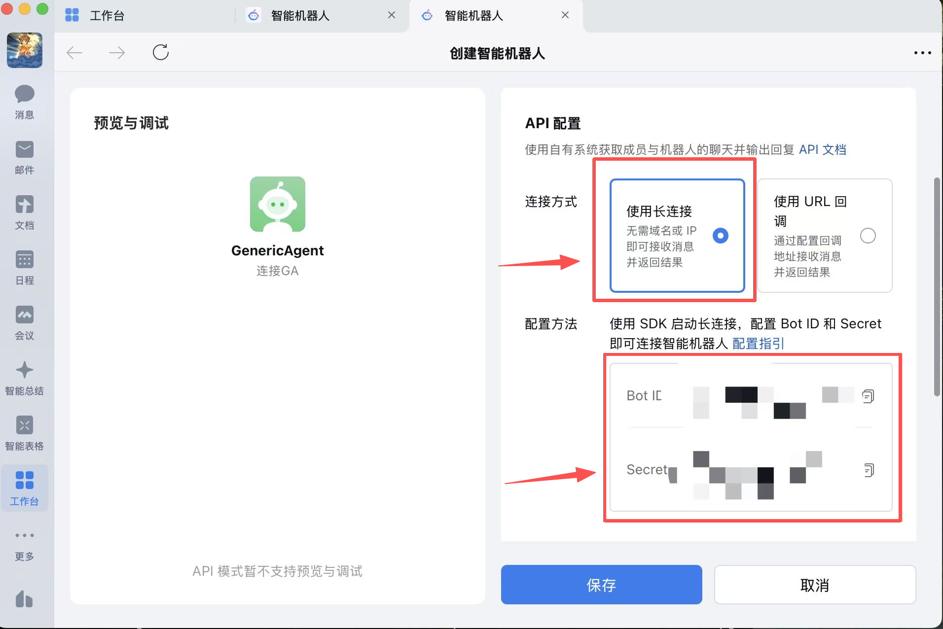 - 选择长连接,获取 Bot ID 和 Secret