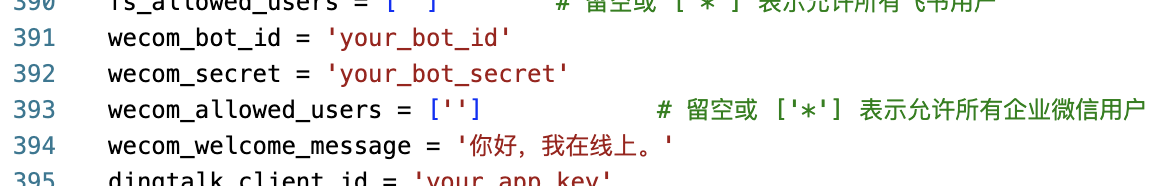 | 企业微信 | frontends/wecomapp.py | wecom-aibot-sdk | wecom_bot_id, wecom_secret |
