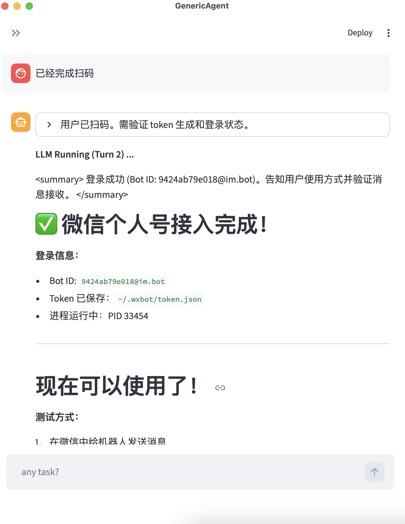 扫码后,终端显示连接成功,你就可以在微信中和 GA 对话了。