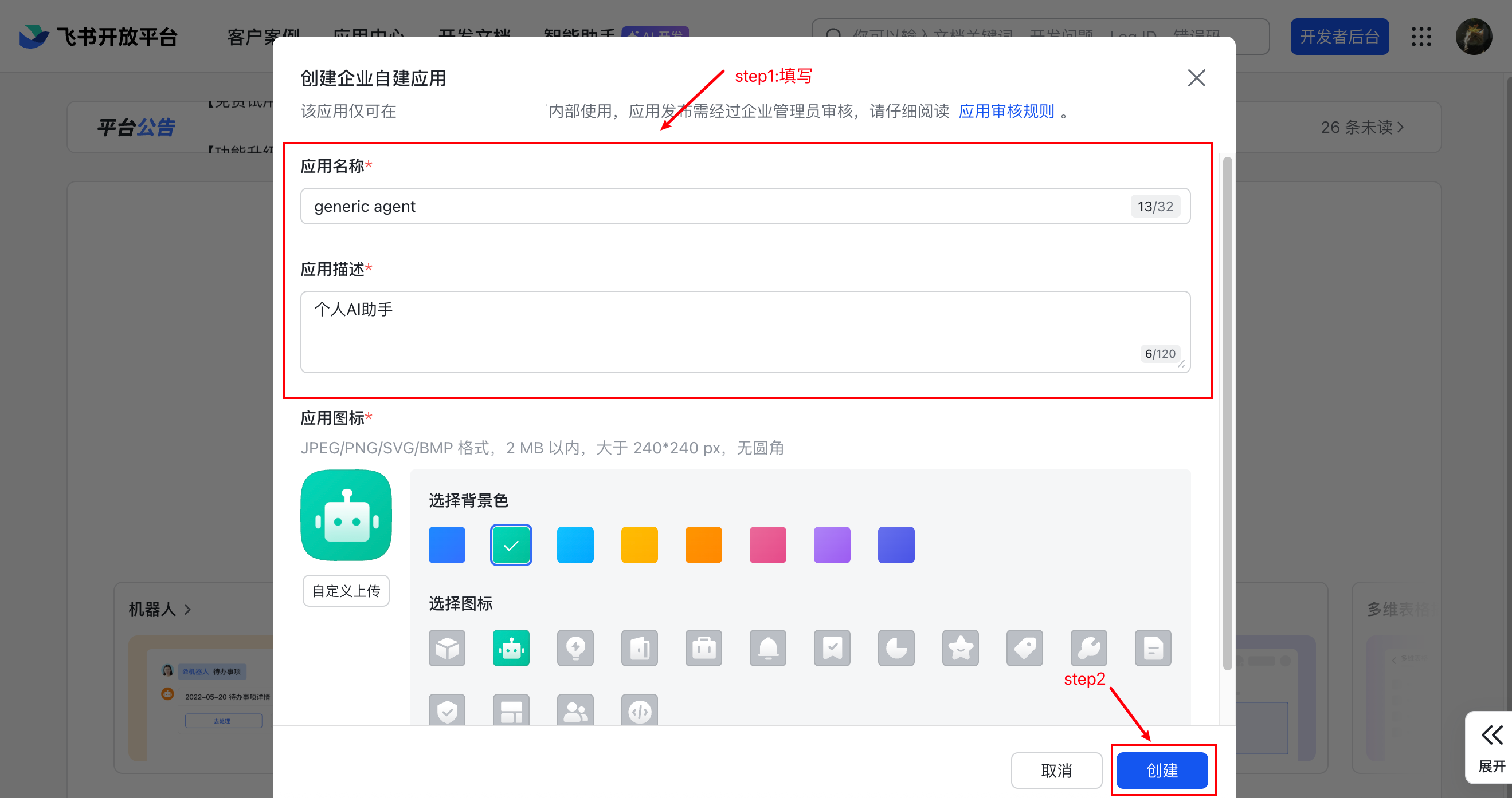 - 点击「创建企业自建应用」,填写应用信息: