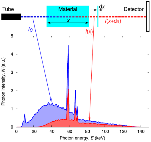 实际的医学CT使用的是多能X射线(能谱范围通常为 20-140 keV)。不同能量的光子有不同的衰减系数,这导致射束硬化效应,需要特殊的校正方法。