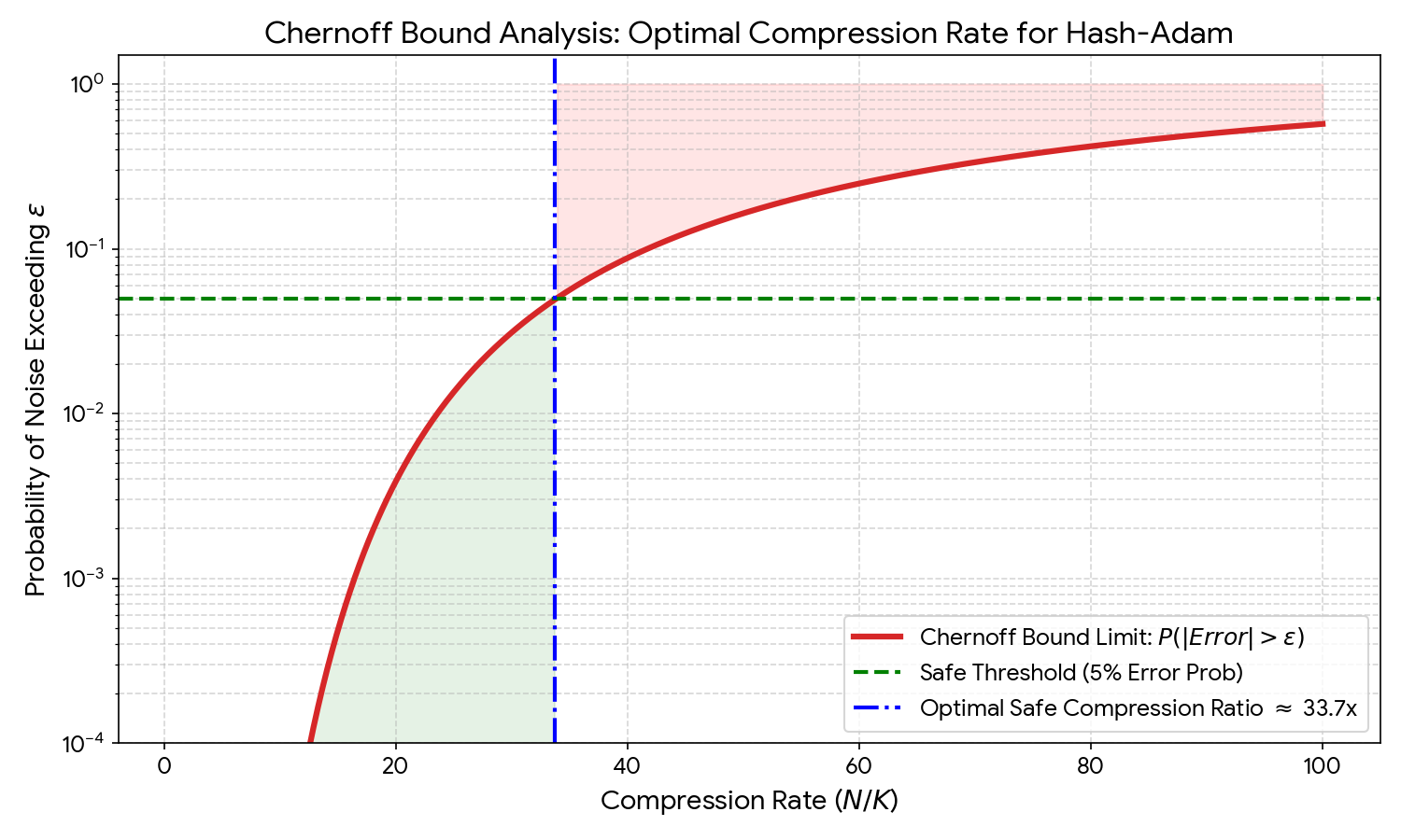 图11.2展示了Chernoff界对压缩率的约束。红色曲线是噪声超过阈值的概率,绿色虚线是5%的安全阈值,蓝色虚线标记最优压缩比约33.7x。在此之前误差概率接近0(绿色区域),之后迅速上升(红色区域),呈现明显的相变特征。