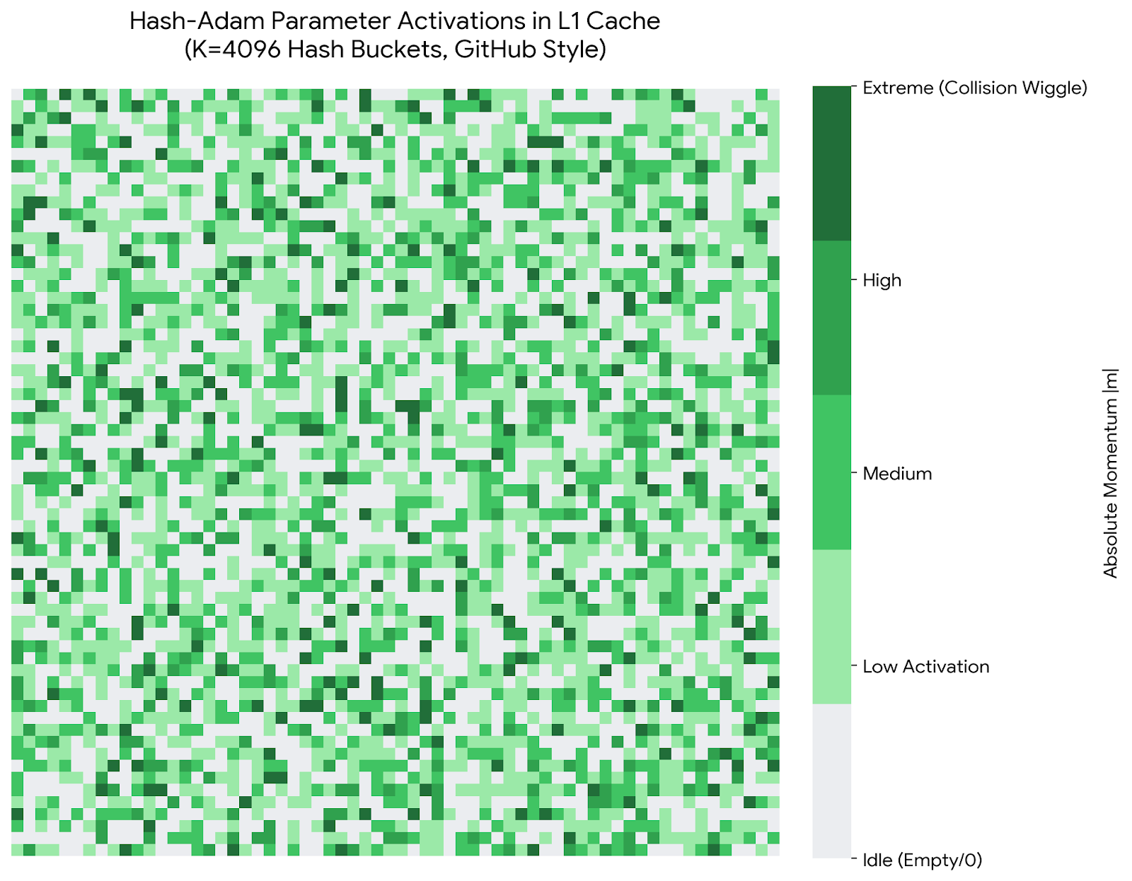 图11.1展示了Hash-Adam在L1 Cache中的参数激活模式(4096个哈希桶)。每个像素代表一个哈希桶的激活强度,颜色从浅绿(低激活)到深绿(高激活/碰撞)。可以看到激活分布相对均匀,没有严重的碰撞热点,这验证了2-Universal哈希的均匀性。EMA机制进一步平滑了碰撞噪声。